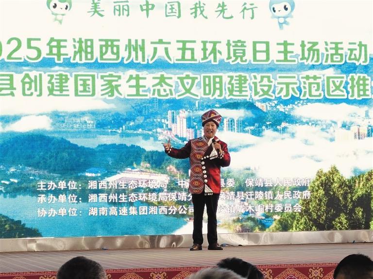 2025年“六五”环境日主场活动在保靖县迁陵镇陇木峒村举行。村民用土家族艺术表演形式展现全州干部群众学习践行“两山”理念的实绩实效。