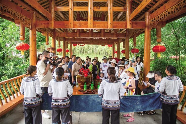竹山苗寨像一部苗族民俗的沉浸式话剧,游客可以体验拦门酒、苗绣、打花带、苗鼓、苗族婚俗等特色民俗。团结报全媒体记者 胡承鼎 摄