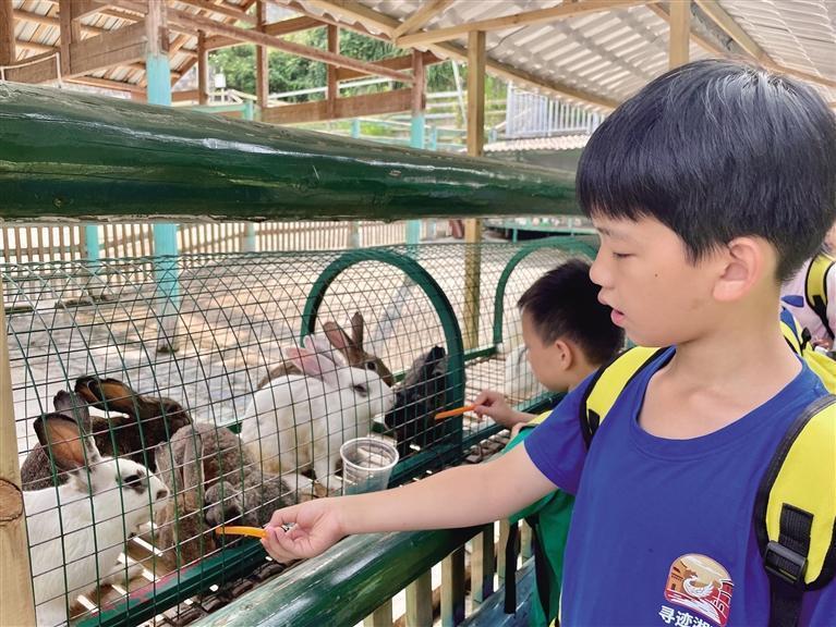 踏出溶洞,森林童话剧场正候场。奇梁洞外的萌宠乐园可谓“麻雀虽小,五脏俱全”,十余种动物可供游客互动,松鼠翘着蓬松尾跃上肩头,白鸽扑棱棱掠过发梢,绒团般的兔子蜷在脚边,小香猪恣意地在草坪上玩耍。解锁乐园官方提供的饲料包,感受投喂小动物的乐趣。
