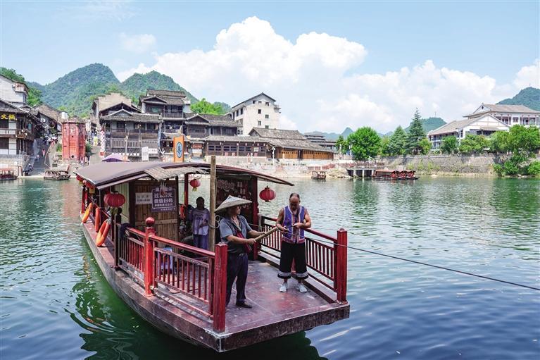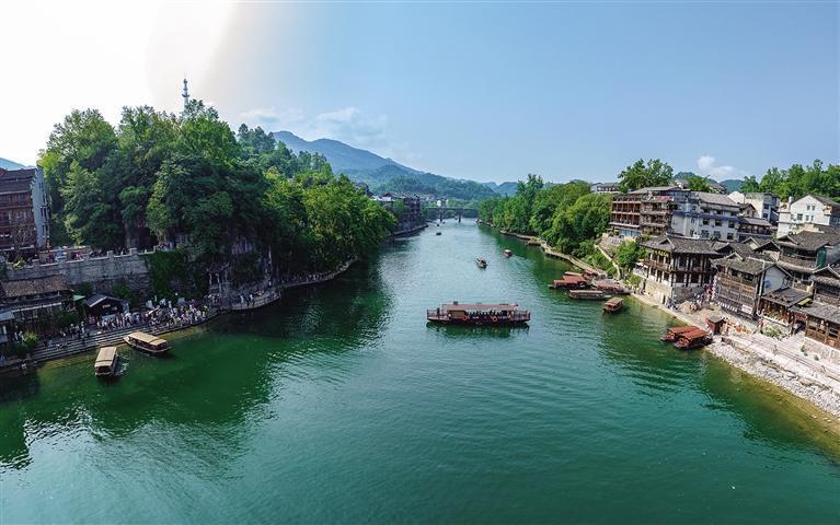 河水清浅处,游鱼拨动水面,漾开圈圈涟漪。碧绿如翡的河面上,古老的拉拉渡牵引着游人往复穿梭。