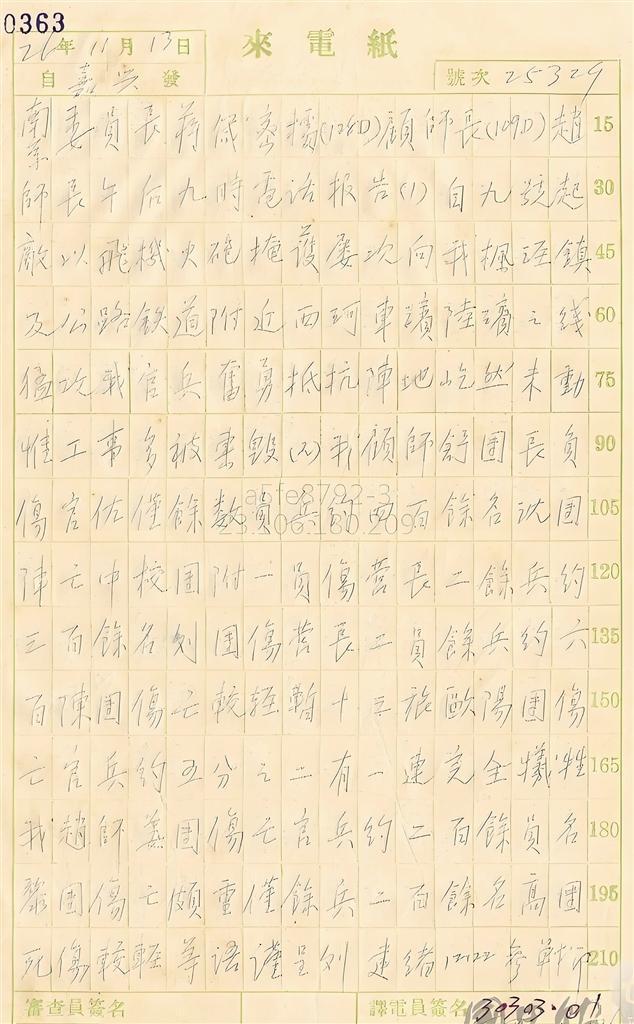 第十集团军报告嘉善阻击战况,涉及128师伤亡情况。“128D顾师长、109D赵师长午后九时电话报告:(1)自九号起,敌以飞机火炮掩护,屡次向我枫泾镇及公路铁道附近西河车浜陆浜之线猛攻,我官兵奋勇抵抗,阵地屹然未动,惟工事多被击毁。(2)我顾师舒团长负伤,官佐仅余数员,兵约四百余名。沈团阵亡中校团附一员,伤营长二,余兵约三百余名。刘团伤营长二员,余兵约六百。陈团伤亡较轻。”(原件存于台湾档案机构)