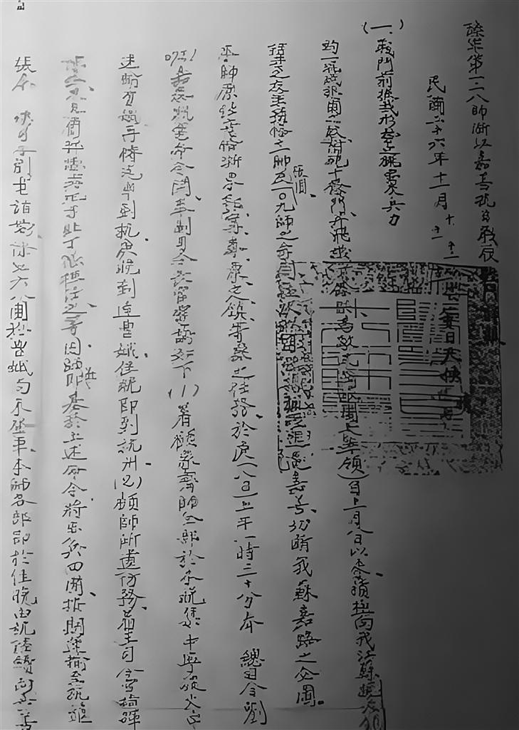 陆军第一二八师浙江嘉善抗日战役战斗详报。(原件存于中国第二历史档案馆)