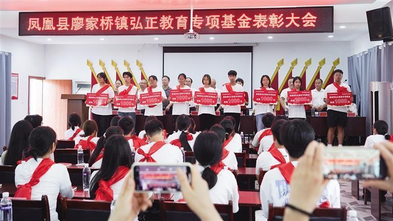 8月24日,凤凰县廖家桥镇弘正教育专项基金表彰活动在菖蒲塘村举行。活动分批次为52名考上本科院校的优秀学子颁发助学金,共计发放7.9万元。 团结报全媒体记者 张谨 通讯员 王成欢 摄