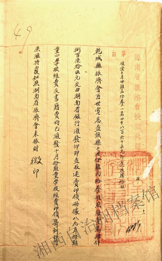 湖南省振济会汇给难童小学经费14865元的通知。(原件藏于吉首市档案馆,湘西州档案馆存有数字化副本)