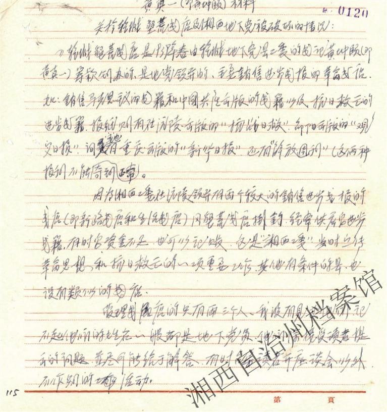抗日战争时期任湘西工委书记的梁春阳回忆“垦荒书店”。 (原件藏于吉首市档案馆,州档案馆存有数字化副本)