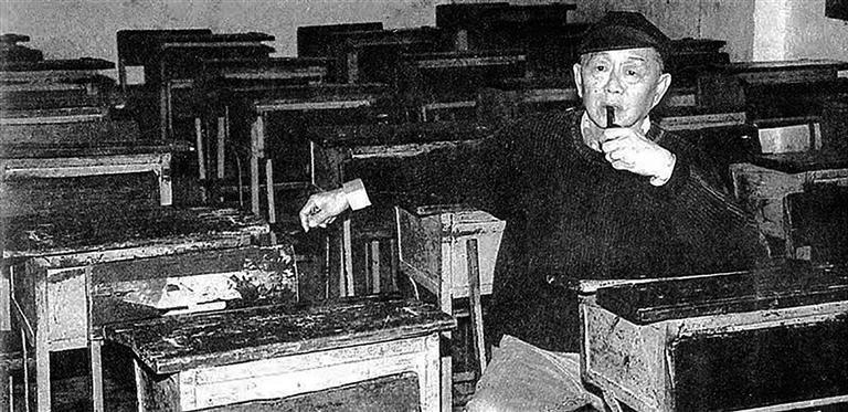 黄永玉回凤凰后,参观文昌阁小学,在自己曾经就读的教室留影。