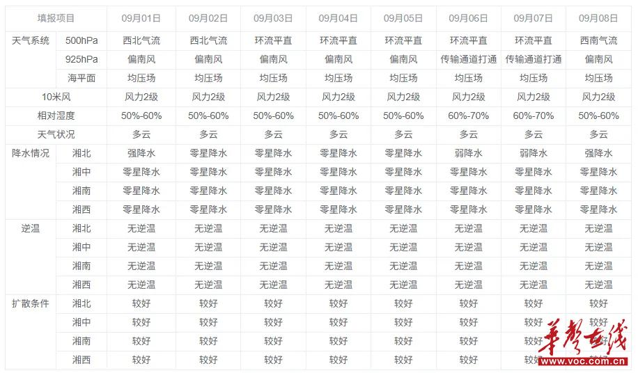 9月3日至6日,受副高控制,地面低压前部转弱气压场,省内以晴热天气为主,多阵性降水,湘中北空气质量良为主,其他地区优至良。