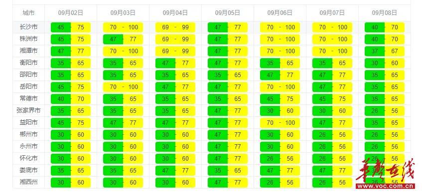 华声在线9月2日讯(全媒体记者 赵瞳铱 实习生 李彦冰)记者今天从省生态环境监测中心获悉,本周(9月2日至8日)湖南受副高控制,以晴热天气为主,局部地区有阵雨,全省空气质量优至良。