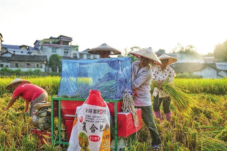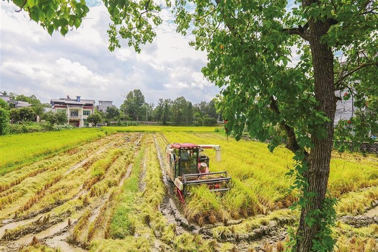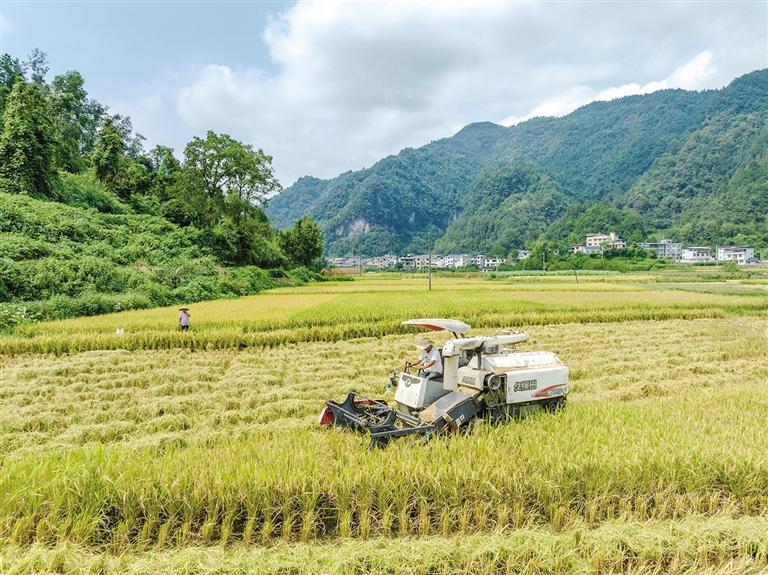连日来,农民驾驶收割机在龙山县石羔街道石羔社区收割水稻。时下,当地种植的水稻相继成熟,农民抢抓农时进行采收,确保粿粒归仓。 曾祥辉 摄
