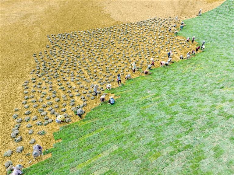 9月15日,吉首市乾州街道兔岩社区,工人正在忙碌铺设草皮。近日,该街道利用百余亩闲置土地推进“城市草地”建设,打造集休闲、观光、健身等功能多样的“口袋公园”。项目建成后,将为市民增添更多绿色休闲空间,提升城市品质和群众的获得感与幸福感。 彭璟 摄