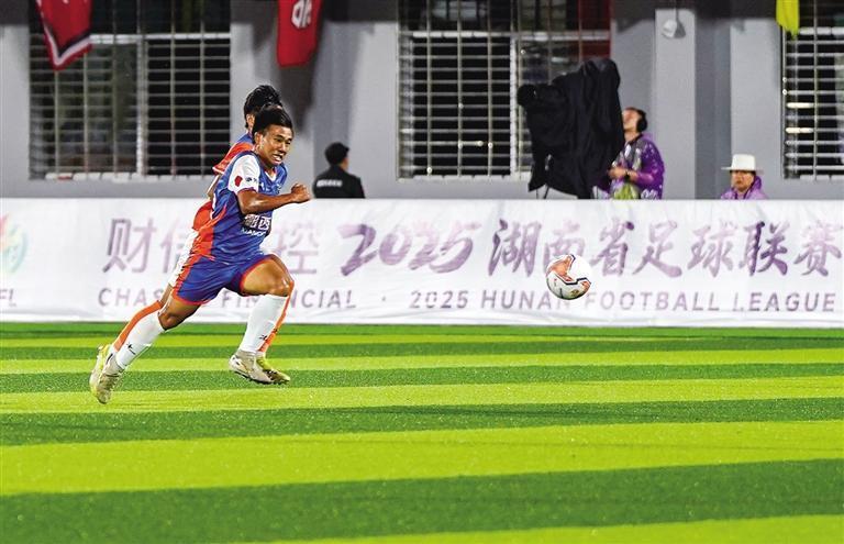 9月13日,2025湖南省足球联赛湘西赛区开赛。这是湘西队球员与益阳队球员拼抢时,两人跑出同样的姿态,重叠在了一起。 本报全媒体记者 杨贤清 摄