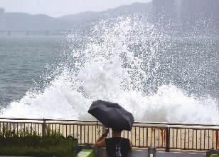 9月23日,市民在香港柴湾杏花邨海边拍摄海浪。组图/新华社