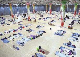 9月23日,在深圳大学粤海校区羽毛球馆,避险群众在场馆内休息。