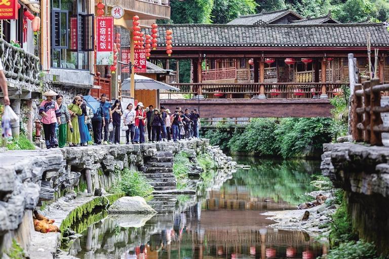 9月27日,世界旅游日,吉首市矮寨奇观旅游区,游客在德夯苗寨游玩。随着国庆、中秋双节临近,该景区游客逐渐增多,旅游逐渐“升温”。 彭璟 摄