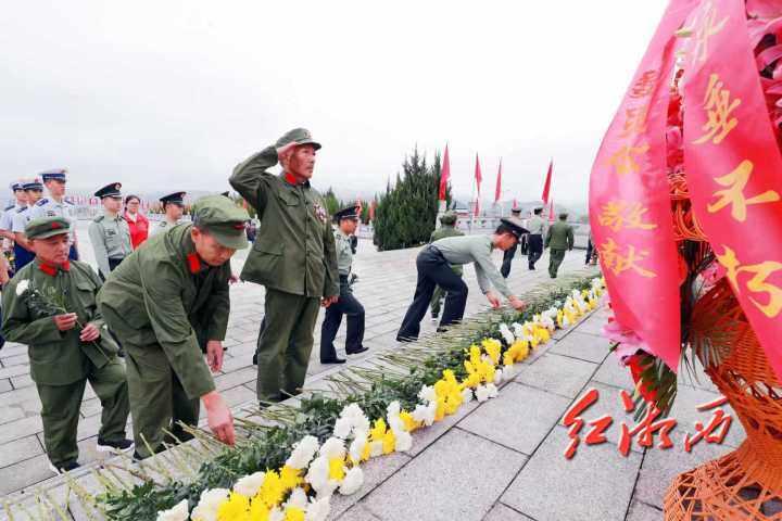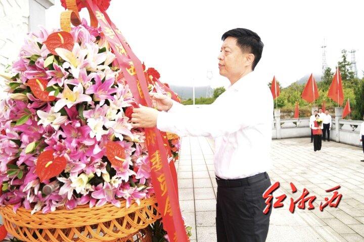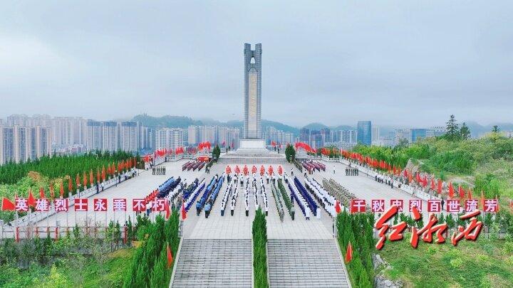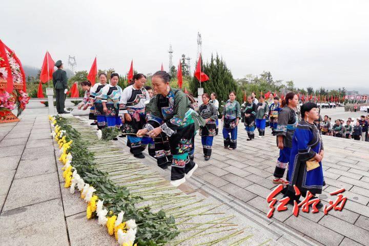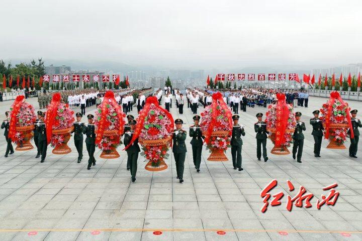 方阵前,以州委、州人大常委会、州政府、州政协、吉首军分区,吉首市委、市政府以及社会各界名义敬献的7个大型花篮依次排列。花篮红色缎带上,“烈士永垂不朽”金色大字熠熠生辉。