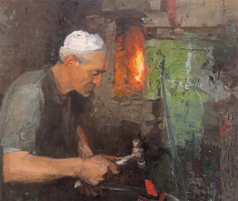 近期创作的大型油画《铁火焠心》,集中体现了其艺术理念。作品以一位躬身劳作的老人为核心意象,背景则突破写实场景的限制,运用炽热的橙红色块与沉静的灰绿色域交织并置,营造出火焰跃动与大地呼吸般的超现实意境。艺术家通过象征性的色彩组织,将劳动场景提升为蕴含精神性的仪式化图景。
