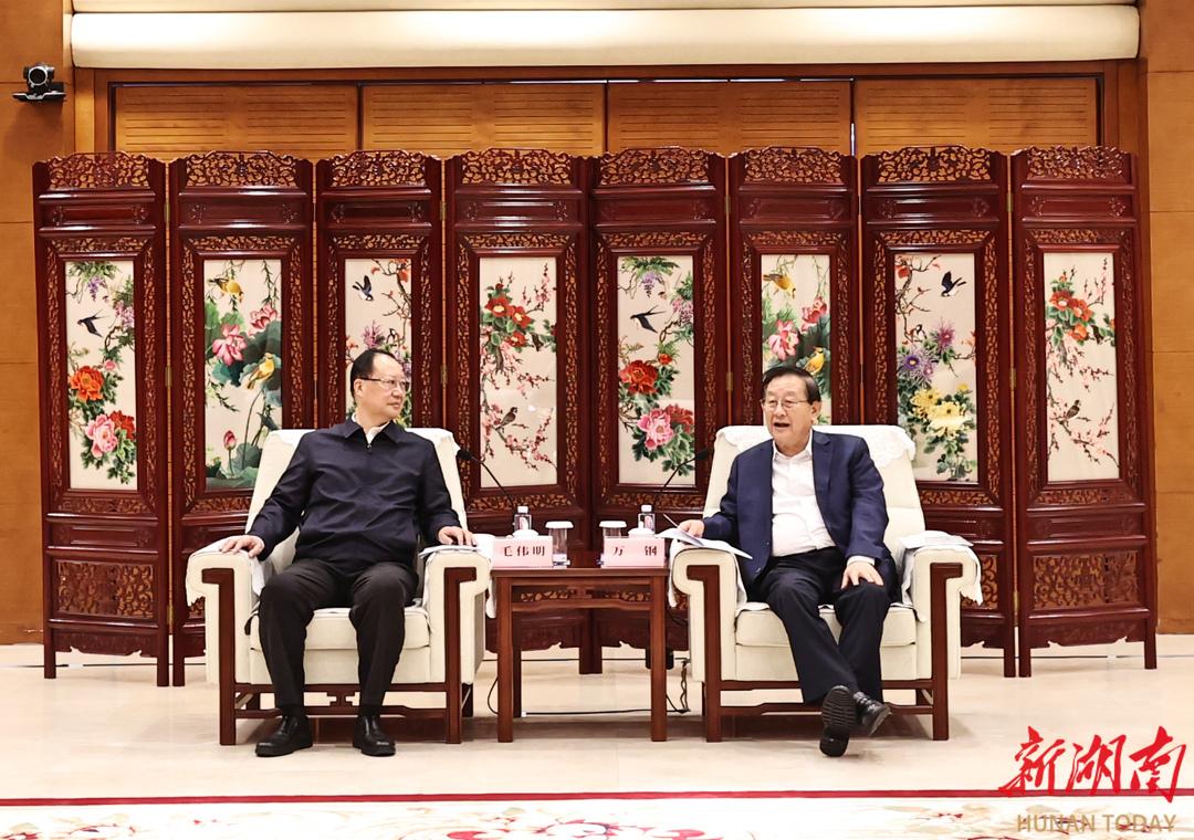 万钢感谢湖南省对科协工作的重视和支持。他说,湖南是全国重要的农业大省、工业大省,近年来,湖南按照习近平总书记擘画的“三高四新”美好蓝图,持续推动科技创新与产业创新深度融合,扎实推动国家重大战略落实落地,创造并放大“自主创新长株潭现象”,新质生产力加速培育壮大,高质量发展态势向新向好。万钢说,中国科协历来高度重视与湖南省的合作,双方在引进科技人才、开展智库咨询等方面的合作成效明显。中国科协将始终深入贯彻习近平总书记重要讲话和全国科技大会精神,聚焦科技前沿领域和国家战略需求,充分发挥中国科协的人才密集、资源富集等优势,深化与湖南在种业创新、轨道交通、工程机械、人工智能等领域的务实合作,发挥各自优势,协同攻坚突破,积极探索央地产学研合作的新机制、新模式,助力湖南加快实现高水平科技自立自强,加快打造具有核心竞争力的科技创新高地。