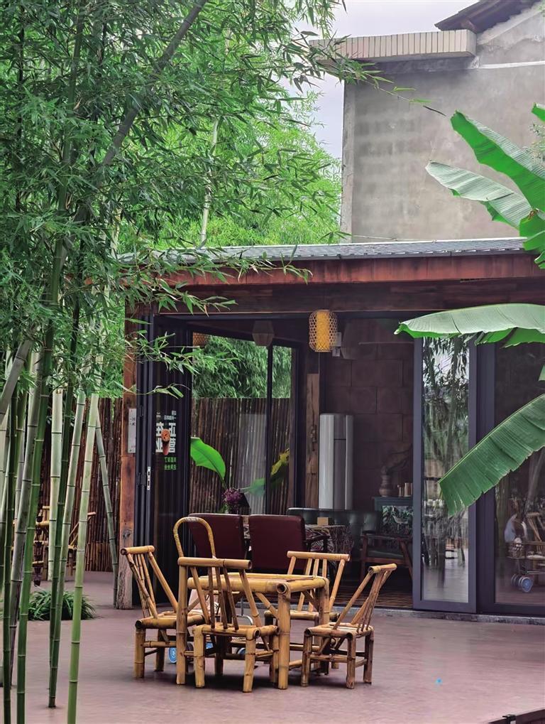 踏入院落,先要经过一段竹林幽径,方能窥见全貌,蓦然间便生出“陶然共忘机”的心境。竹丛从木质地板里冒出来,成簇的被修剪后用竹篱笆圈护,单株的自在生长;竹编桌椅错落摆放在竹丛中,显得格外幽雅、韵致。阳光穿过竹叶,在叶面上跳荡着嫩绿光点,在林间投下斑驳光影。一位女孩在桌边饮茶,翠绿茶叶浮在透明杯中,香气自杯口袅袅升起;和弦风铃挂在林间,奏着淡雅清新的歌谣,高高低低、清脆悦耳。