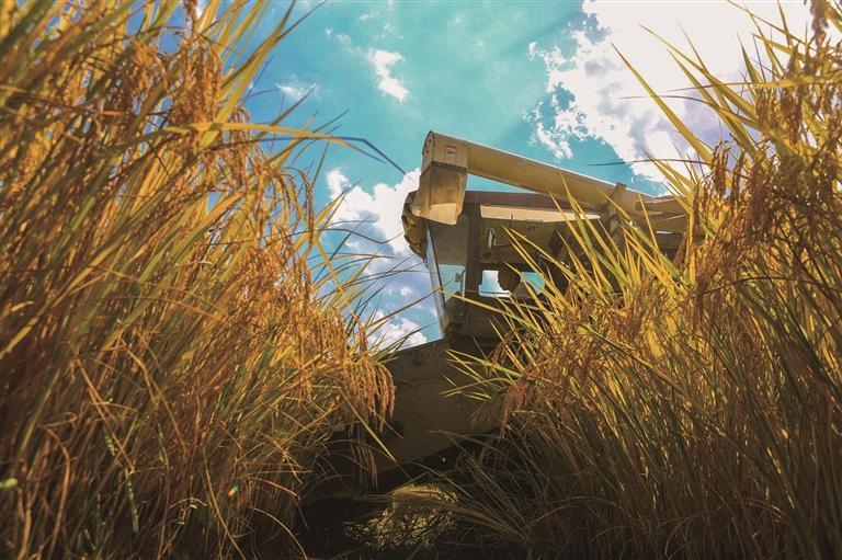 10月10日,龙山县兴隆街道尖岩村,农民驾驶农机在收割水稻。金秋时节,当地农民抢抓农时收割水稻,确保颗粒归仓。 曾祥辉 摄