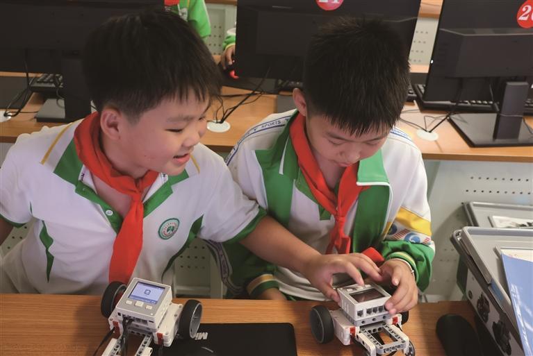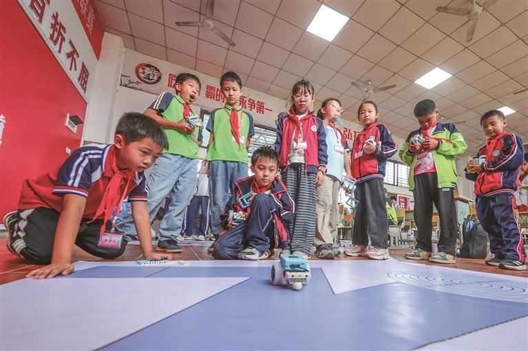 10月14日,州砂子坳小学学生在课后服务中测试机器人。该校大力加强科学学科建设,在上好科学课的同时开设机器人编程社团,激发学生对科学探究的兴趣,培养学生创新精神和动手实践能力,放飞学生的科技梦想。彭彪 摄