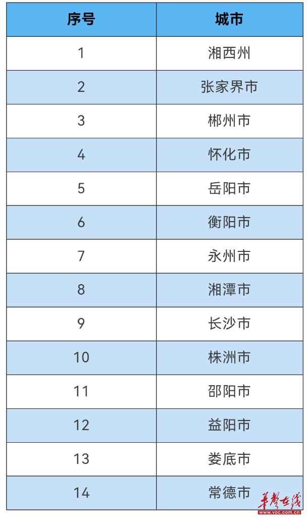 按PM₂.₅浓度同比变化,从好到差依次为:张家界市、益阳市、湘潭市、长沙市、株洲市、常德市、衡阳市、岳阳市、娄底市、邵阳市、湘西州、郴州市、永州市、怀化市。