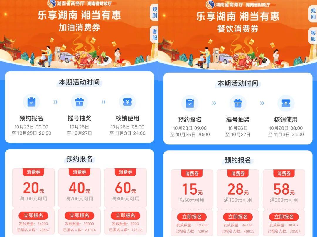 活动期间(10月至12月),湖南在全省范围内发放总金额达1亿元的消费券,采用“报名摇号”机制,无需抢券,让消费者公平参与。10月23日至25日为消费者报名期。