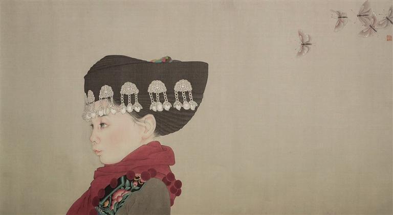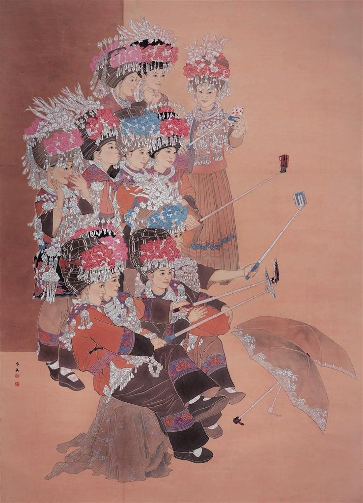 苗族女子盛装时,总将一生荣光戴于头顶。现代科技画面内,却记录下古老的技艺。 向水英 画作