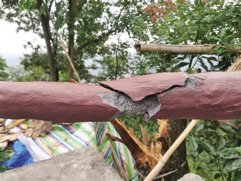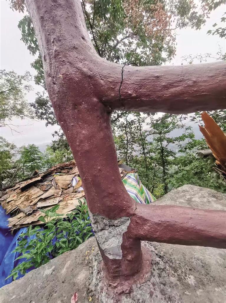 一个周末,记者例行登山健身,恰巧碰到白云寺的工作人员,便向其询问缘由。对方解释道,护栏的这几处破损并非人为所致,而是坎下的一棵老樟树经不住风雨侵蚀,逐渐倾倒后压在护栏上,导致部分护栏断裂、破损。