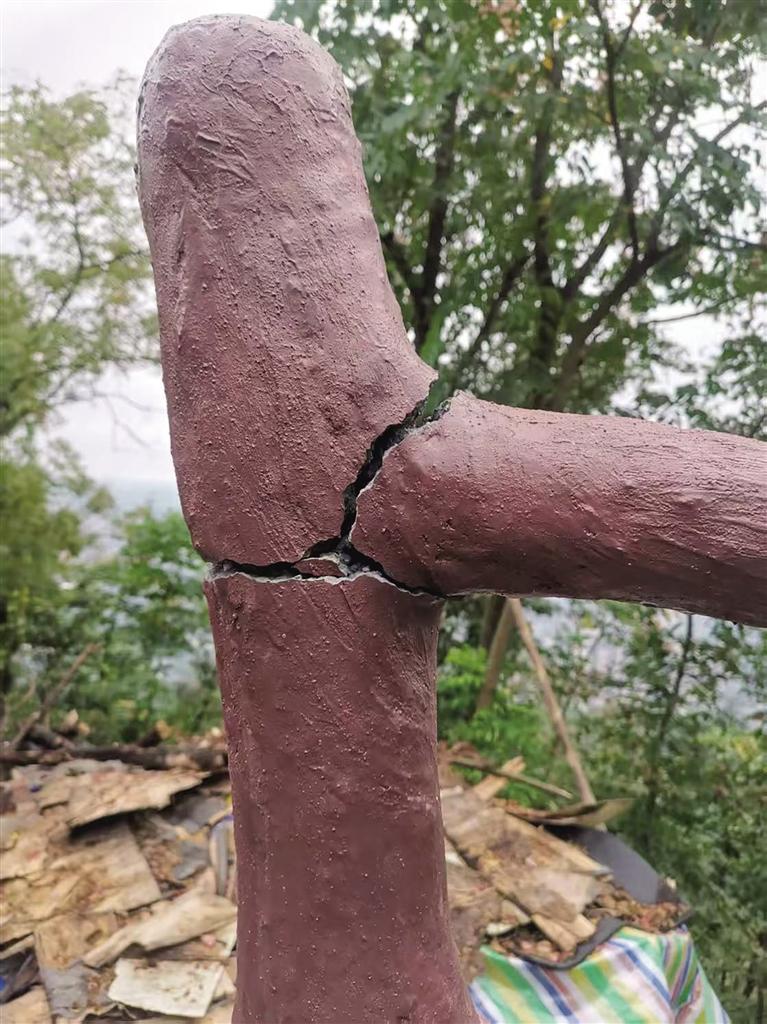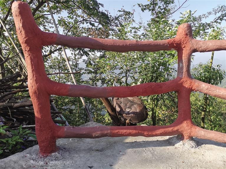 11月13日,难得的晴日。记者在吉首市乾州仙镇山山顶的白云寺坪场上看到,太阳能灯杆旁、今年夏天刚完工的护栏上,几处破损已被修复。尽管修补处与原护栏颜色相近,仍能清晰看出修复痕迹。