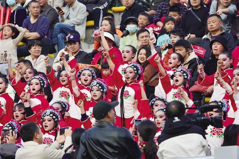 11月29日,湘超联赛第十二轮,湘西队主场迎战湘潭队,来自凤凰县沱江镇文昌阁小学“文武茶灯”非遗展演节目的小演员们为比赛加油助威。 本报全媒体记者 胡承鼎 摄