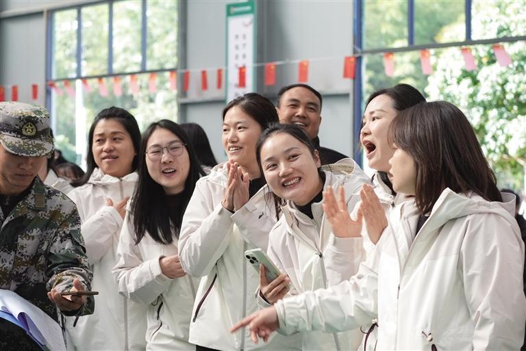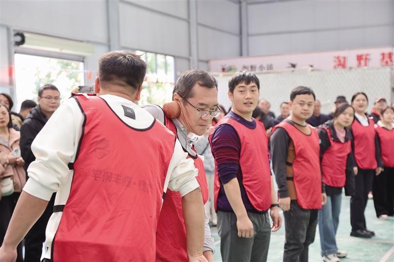 “勾肩搭脚”趣味运动中,“狂浪队”的队员们肩并肩、脚碰脚,共同托起一根竿子。他们的肩膀紧紧相扣,在领队一声令下后,整齐地向着终点跃动,步伐稳健地绕过中点,动作干净利落。在“蛇来运转”中,各队成员连贯成一条游动的长蛇。“荣耀队”仿佛化身真人版贪吃蛇,在领航员的精准调度下,首尾呼应,灵活地绕过障碍,行进路线干净利落,引来阵阵赞叹。