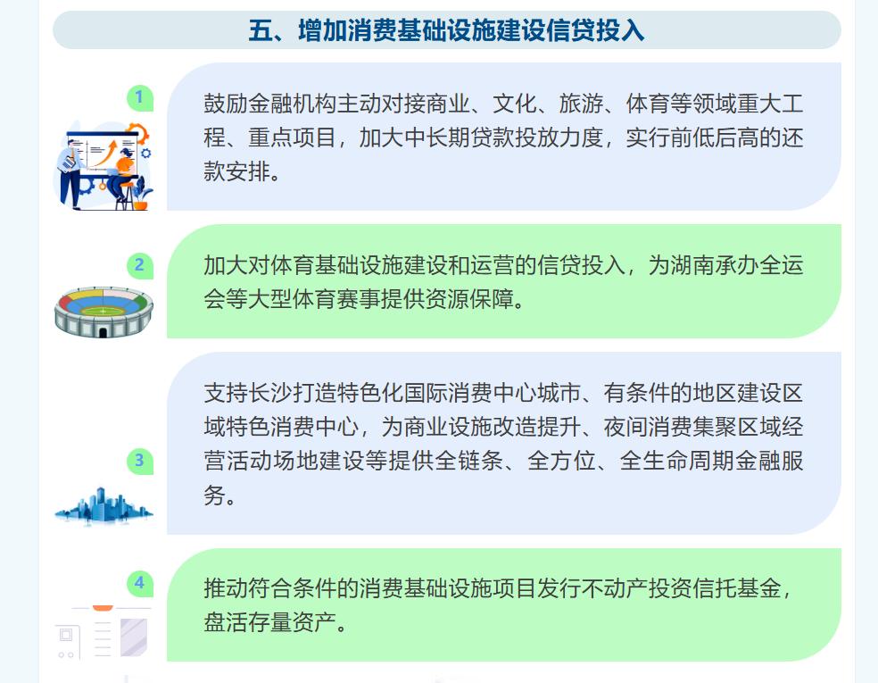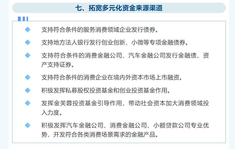 《通知》强调要拓宽多元化资金来源渠道,支持符合条件的发债主体发行企业债券、专项金融债券、资产支持证券等。同时,鼓励符合条件的消费企业在境内外资本市场上市融资;积极发挥各类投资基金作用,加大消费型企业股权投资;发挥金芙蓉投资基金引导作用,带动社会资本加大消费领域投入力度;积极发挥汽车金融公司、消费金融公司、小额贷款公司专业优势,开发符合各类消费场景需求的金融产品。