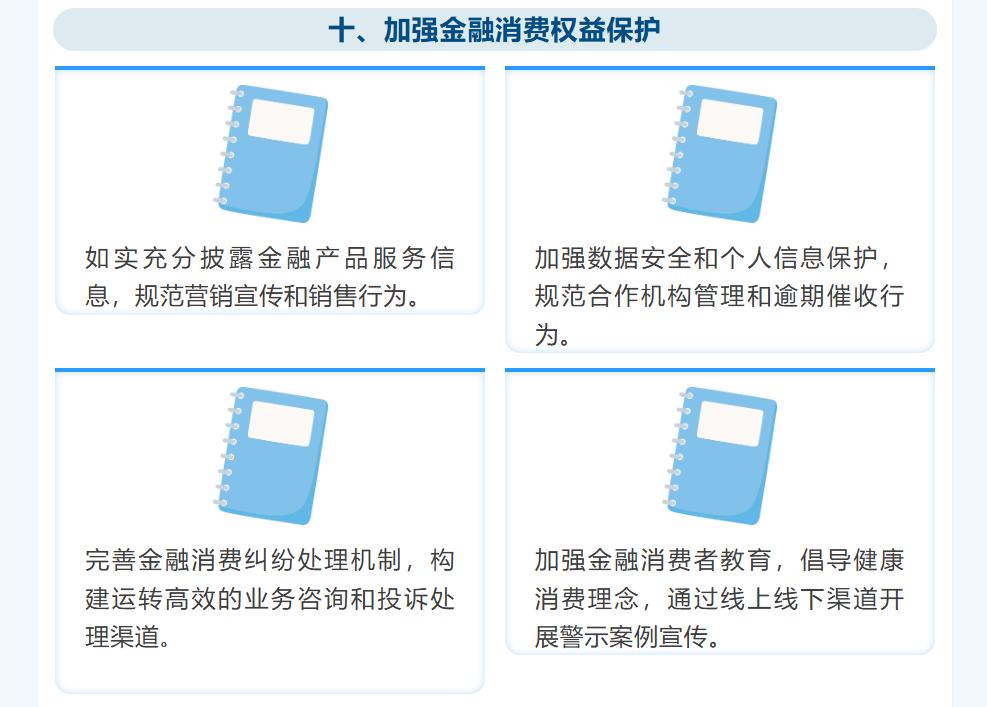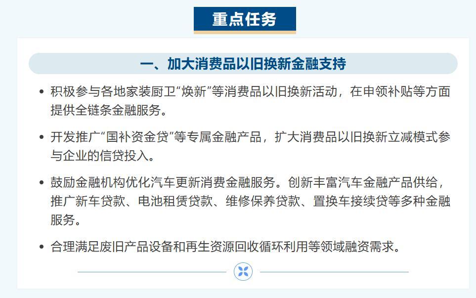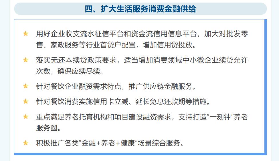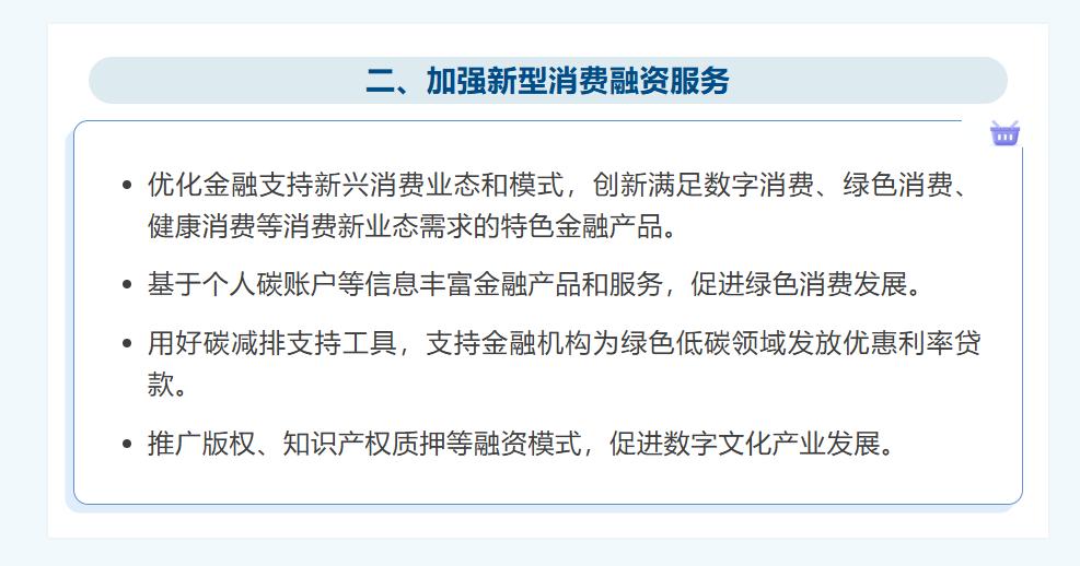 《通知》要求加大对消费品以旧换新、新型消费、文体消费、生活服务、消费基础设施、商贸流通等关键消费领域的金融支持力度,创新丰富金融产品供给,推动金融机构消费领域金融服务能力持续提升,金融产品和服务体系更加多元化,金融供给力度持续加大,形成多元、便捷、高效的消费金融服务体系。