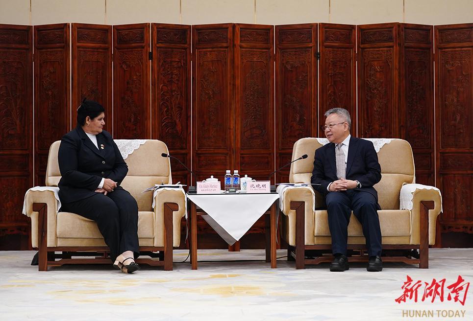 沈晓明代表省委、省政府对代表团一行表示欢迎。他说,近年来,在两国元首战略引领下,湖南与古巴交流频繁,党政交往更加密切,互学互鉴不断深入,农业、生物医药等领域合作积极推进,取得丰硕成果。希望双方在良好合作基础上,进一步深化拓展在文化旅游、新能源、信息通讯等领域的务实合作,更好造福两地人民。