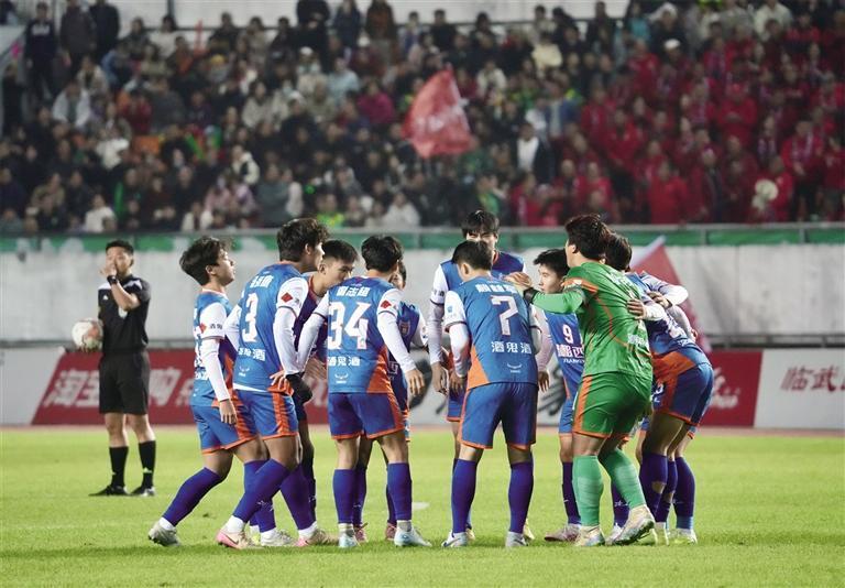 11月21日晚,“湘超”第十一轮,湘西队客场挑战郴州队,湘西队球员围成一圈互相加油打气。 团结报全媒体记者 胡承鼎 摄