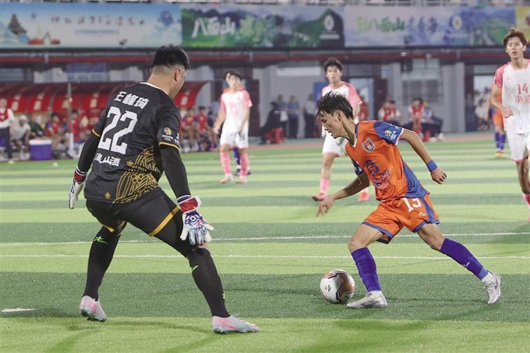 10月11日,“湘超”第五轮,湘西队主场迎战常德队。面对被誉为“穿得最粉,踢得最狠”的常德队,湘西队选择以攻对攻,踢出一身昂扬少年气。图为瘦小的刘云合晃过对方高大守门员,打进本场比赛中个人第二粒进球。 团结报全媒体记者 胡承鼎 摄