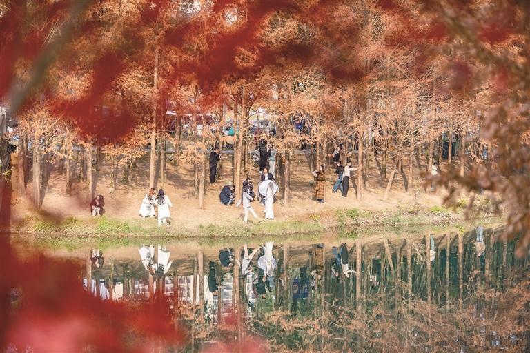 12月7日,湘西高新区吉凤街道湾溪社区,市民在湾溪河畔的水杉树下拍照打卡、赏景游玩。时下,该社区的水杉树迎来最佳观赏期,色彩斑斓,吸引众多市民前来休闲打卡,乐享冬日美好时光。 彭璟 摄
