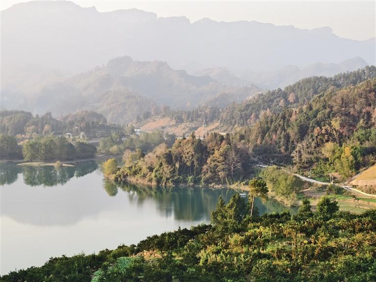 和平村的晨又是另一番景致。薄雾缭绕在青山绿水间,晕开一幅淡雅水墨。微风过处,树叶沙沙,似在低语夜的静谧与晨的清新。格则湖像条沉睡的鲸鱼,在雾气中时隐时现,垂钓人的帐幕,五颜六色,恰似绣在鱼身的五彩荷包。一幢幢红瓦楼房与澄黄的稻田拥抱在一起,勾勒出祥和安宁的田园画卷。