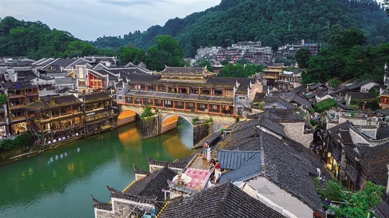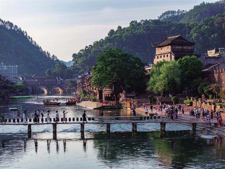 凤凰古城山水相依,桥上行人悠然,城墙古朴,一切宁静祥和。 团结报全媒体记者 张谨 摄