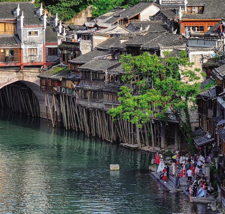 凤凰古城,沱江之上,吊脚楼群依山傍水,古桥横跨两岸,山水与人文交融,尽显静谧与浪漫。 团结报全媒体记者 张谨 摄