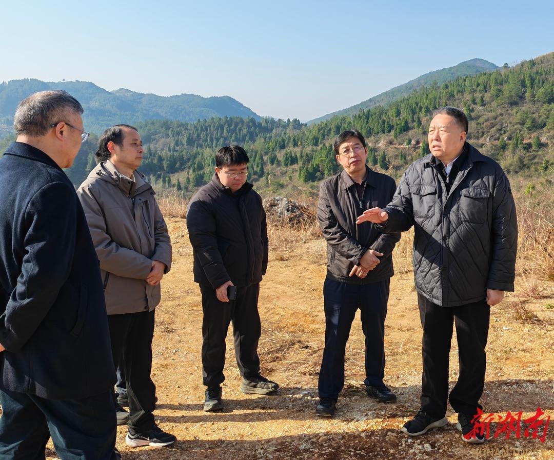 12月14日,省政协主席毛万春深入省政协办公厅乡村振兴帮扶联点村新化县吉庆镇坪塘村宣讲调研。图为毛万春在坪塘村黄精种植产业园调研。