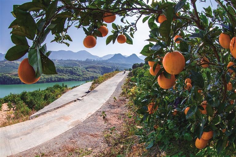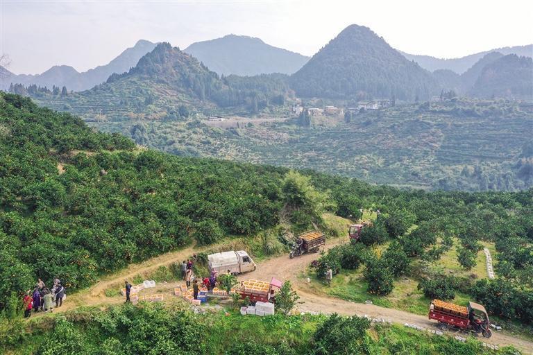 初冬,龙山县里耶镇比耳村,漫山遍野灿烂金黄,沉甸甸的脐橙挂满枝头,空气中弥漫着醉人的甜香。一条条平整的山路在果林间蜿蜒,前来收橙子的货车一辆辆将希望延伸,一派生机盎然的丰收景象。