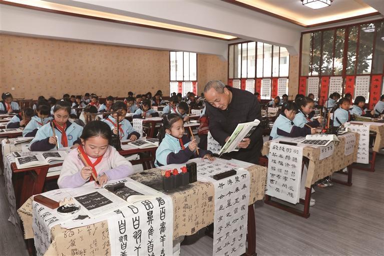 12月22日,吉首市第三小学学生在书法指导老师指导下练习书法。近年来,该校将书法教学纳入校本课程,配备专业书法教师,循序渐进培养学生的书写能力,激发学生对书法艺术的兴趣和热爱,为校园注入浓郁的传统文化气息。 李进辉 摄