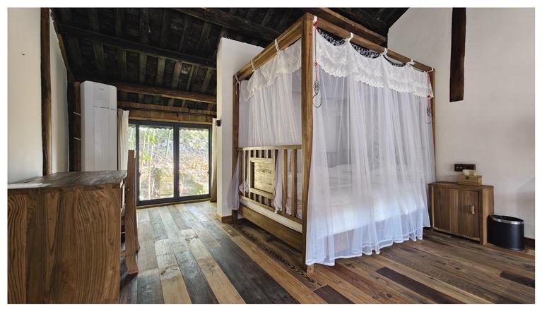 楼上的房间里,有空调有马桶有浴缸,木床上是星级宾馆的“布草”,最特别处是每张床上都罩着一顶粗纱蚊帐——我喜欢深色的帐子,其营造的小空间必然带来更大的安全感——在万物有灵的湘西苗乡,没有蚊帐的“假装”隔绝,万籁俱寂时会很容易联想到各式各样的异界灵体。