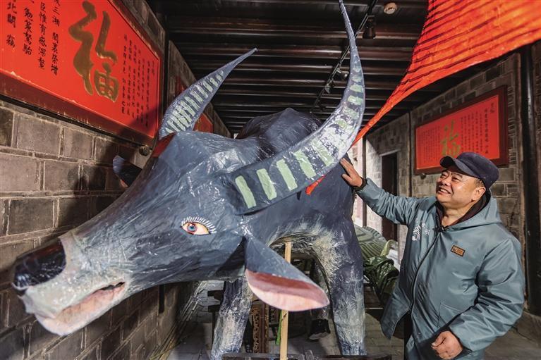 《坚守》1月20日,吉首乾州,非遗项目“乾州春会”州级传承人滕冬生抚摸着即将闹春的“春牛”。