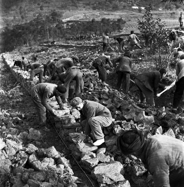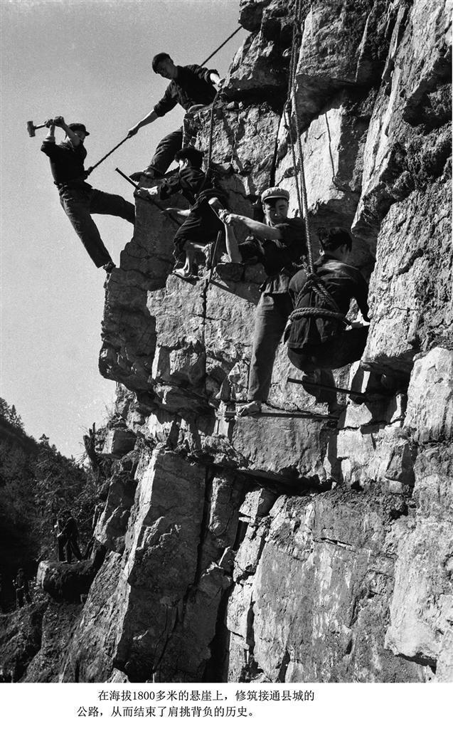 1969年,龙山县洛塔公社,社员们在海拔1800多米的悬崖上,修筑接通县城的公路。 唐克立 摄