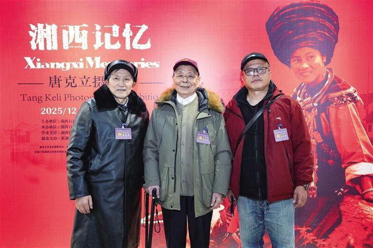 2025年12月,“湘西记忆——唐克立摄影展”,唐克立(中)、陈庭茂(左)、张谨(右)三代摄影人合影留念。 杨贤清 摄