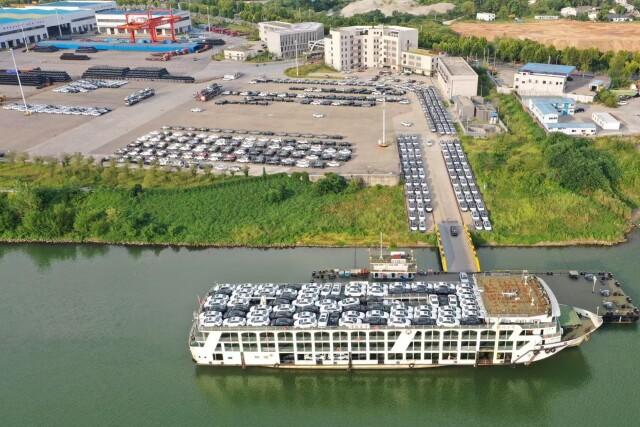 1月3日,在城陵矶港口集团长沙新港码头,一辆辆汽车正在驶入滚装船。