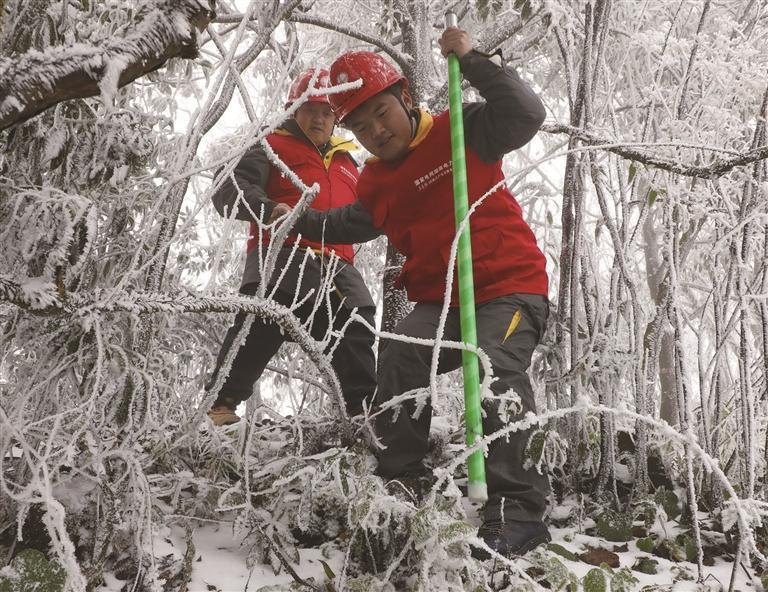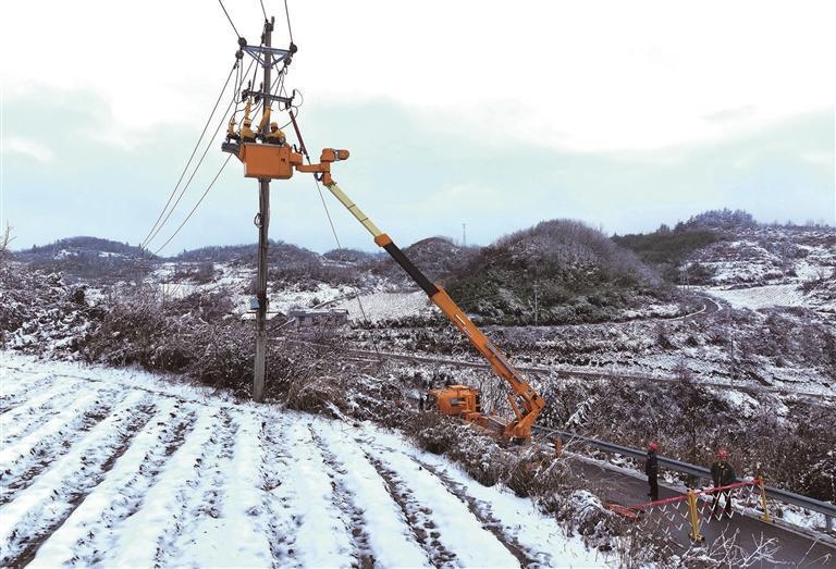 1月4日,国网保靖县供电公司的党员服务队在清水坪镇中溪村踏雪巡线,对受冰雪影响的高低压线路、配变设施进行巡查和排障,以保障群众稳定供电。 俞采华 向紫彬 摄