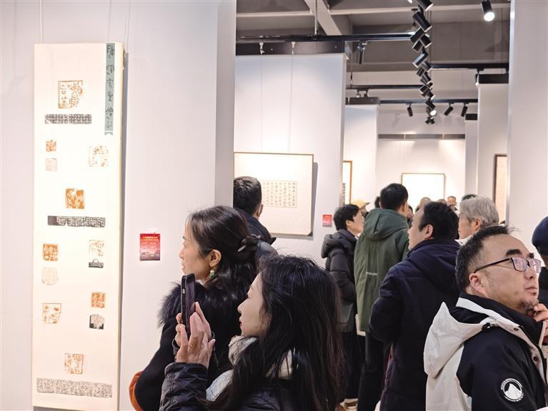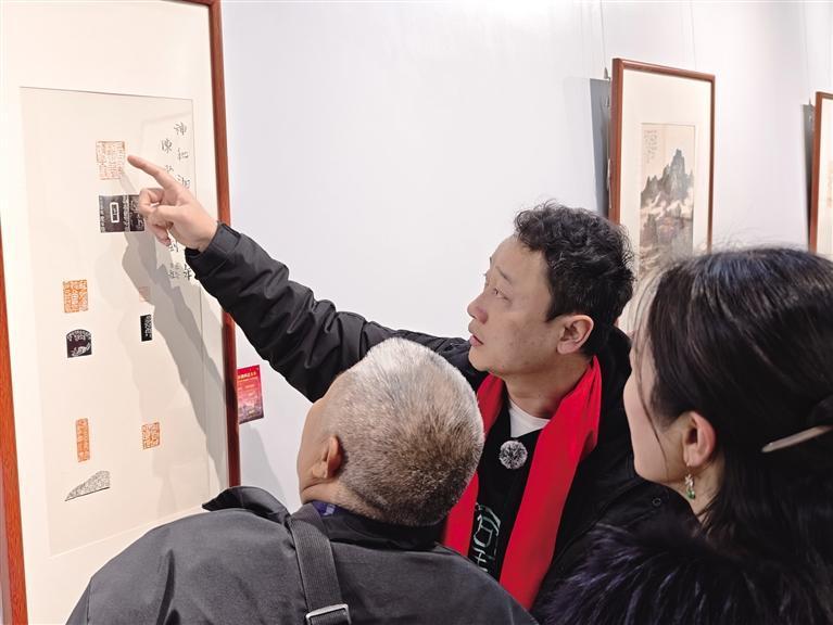 陈建平为观展者讲解自己的篆刻作品。 团结报全媒体记者 朱开朗 摄